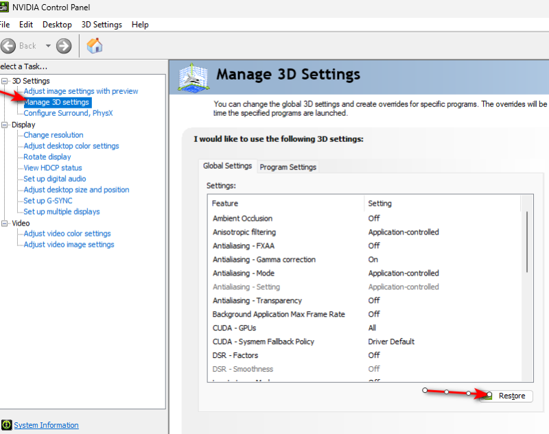 1-es és 3-as menüpont legyen aktív "pipa" az Nvidia Controlba