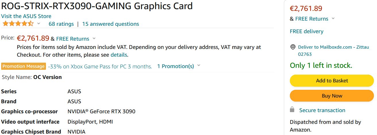 EVGA RTX 3090 FTW3 Ultra Gaming 2449€ ;csak német címre