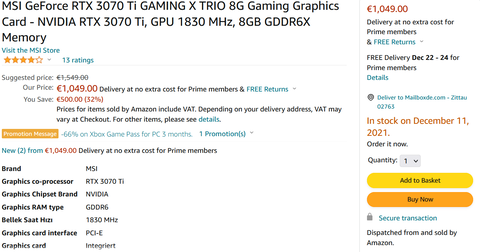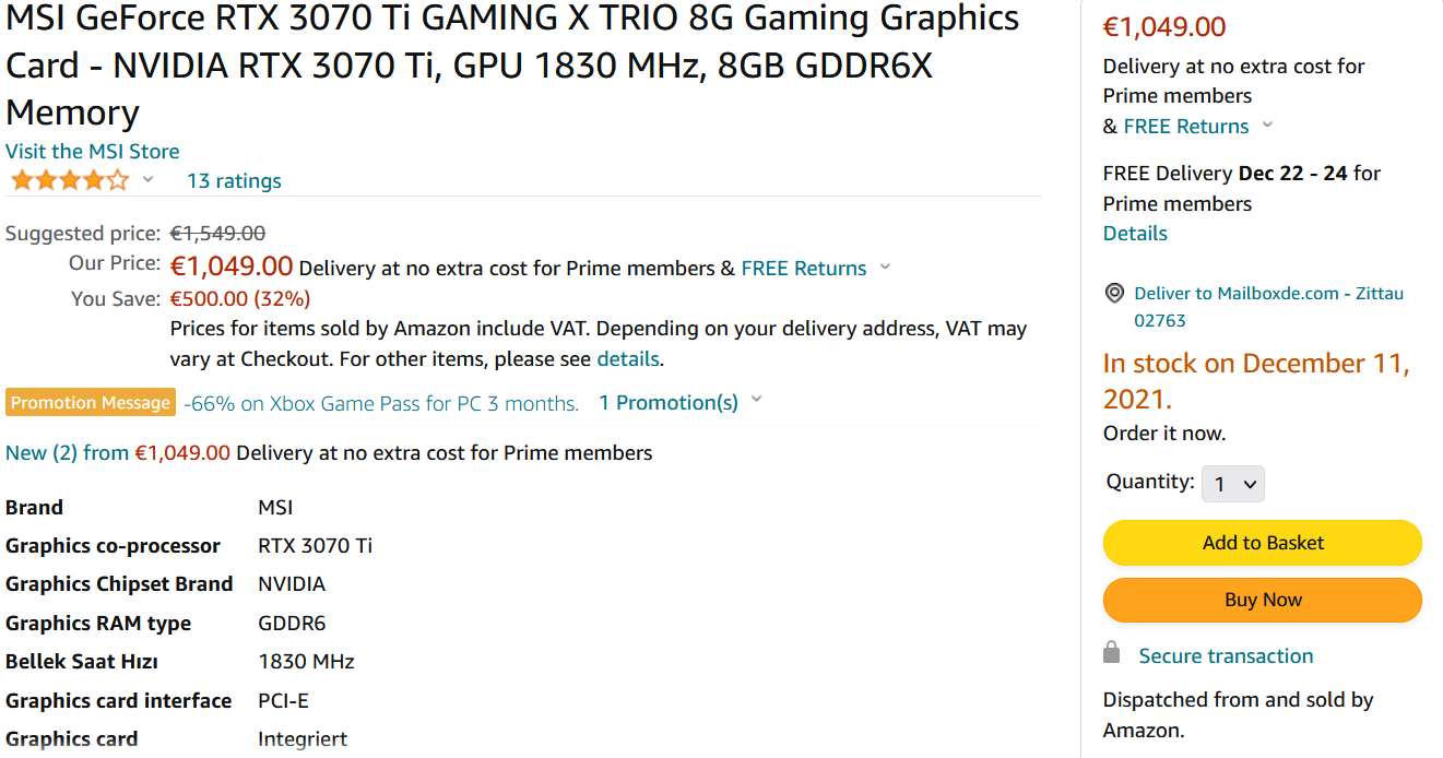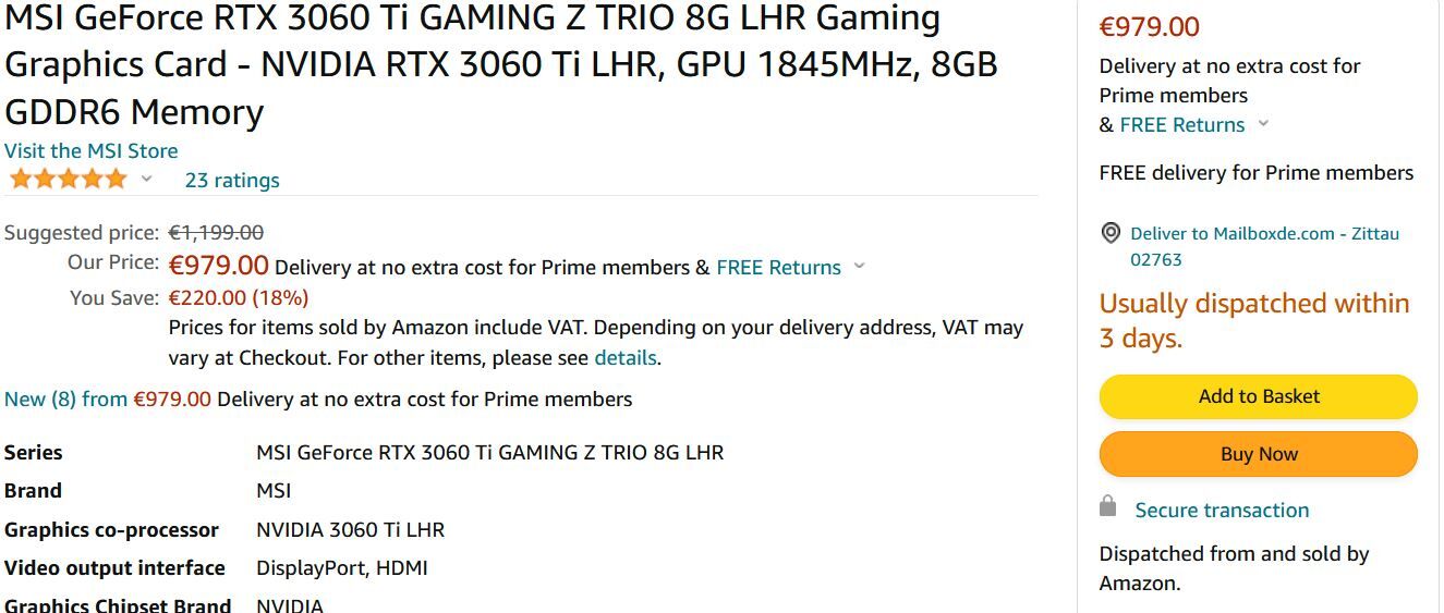 Olasz amazonon 14:30-kor volt néhány másodpercig (értsd: 2-3) MSI 3080 Gaming Z Trio 1.292,99 euróért.