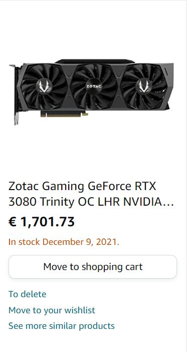 Amazonon eléggé csend és hullaszag van, Zotac kártyák kifogytak, néha volt még 1-1 3080 Trinity de már 1710 ! euró feletti áron (francia amazon) a többi aloldalon nem tudtam már árat nézni, mert ki sem listázták a termékoldalon, csak a kosárban mozgott.