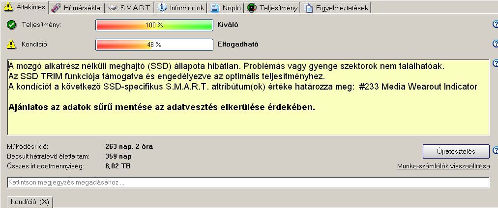 Szüleimnél lévő E6440-ben van a "leghasználtabb" 250Gb-os Samsung 840 Evo. Még 2017-ben vettem használtan a HA-ról, most olyan 200 üzemóra van benne, és két Win újratelepítés. Alapjában véve csak OS és alap programok vannak rajta. Még mindig 98%-ot ír a Sentinel.