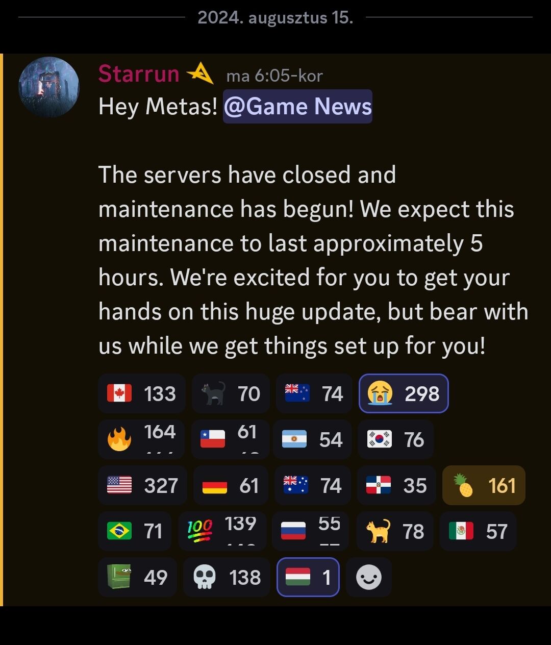 Már fixálták és működik, de azt írta ki, hogy fullon a szerver ezért nem lehet már oda regisztrálni. Pár szervert megnyitottak a wipe előtt és úgy néz ki, hogy ezek (vagy többségük) beteltek.