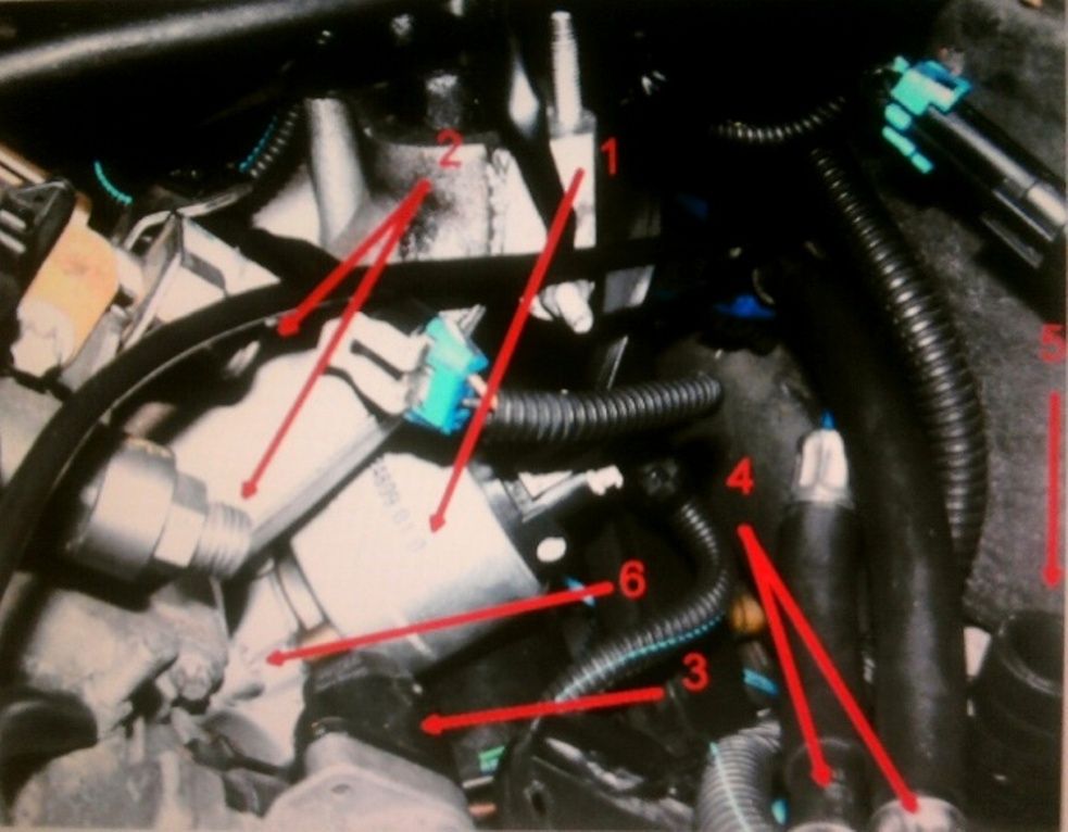 (1) EGR-szelep, (2) benzincsonkok az injektorhídon, (3) alapjárati motor, (4) táp- és visszafolyó benzincső, (5) tágulási tartályra csőcsonk, (6) EGR-szelep rögzítő csavarjai. (2db)