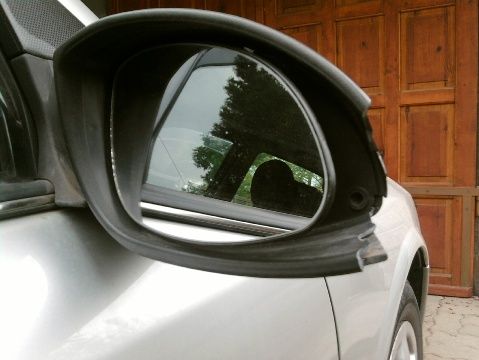 Volt egy kis dolgunk,vittük őt is.Garázsajtót kinyit, de nem támasztotta ki,csak állt mellette,mint aki díszőrséget áll.Én tolattam ki,bal tükörbe néztem hátra, a szél lassan fújta befelé az ajtót,és a tükör a kilincsbe beakadt.Felső burkolat kipattant, a széléből két kisebb darab kitört,tükör oldalra lekornyadt.