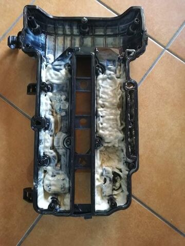 A tünet az volt, hogy fogy a víz. Rövid utakon bemelegedés nélkül is deciliter mmennyiségben fogyott. Olajbeöntő kupak belső fele taknyos, kívülről a csövek, csatlakozók, blokk oldala tiszta. Miután a látható helyeken nem találtuk a hűtőközeg nyomát, már tudtam hogy bontás lesz.