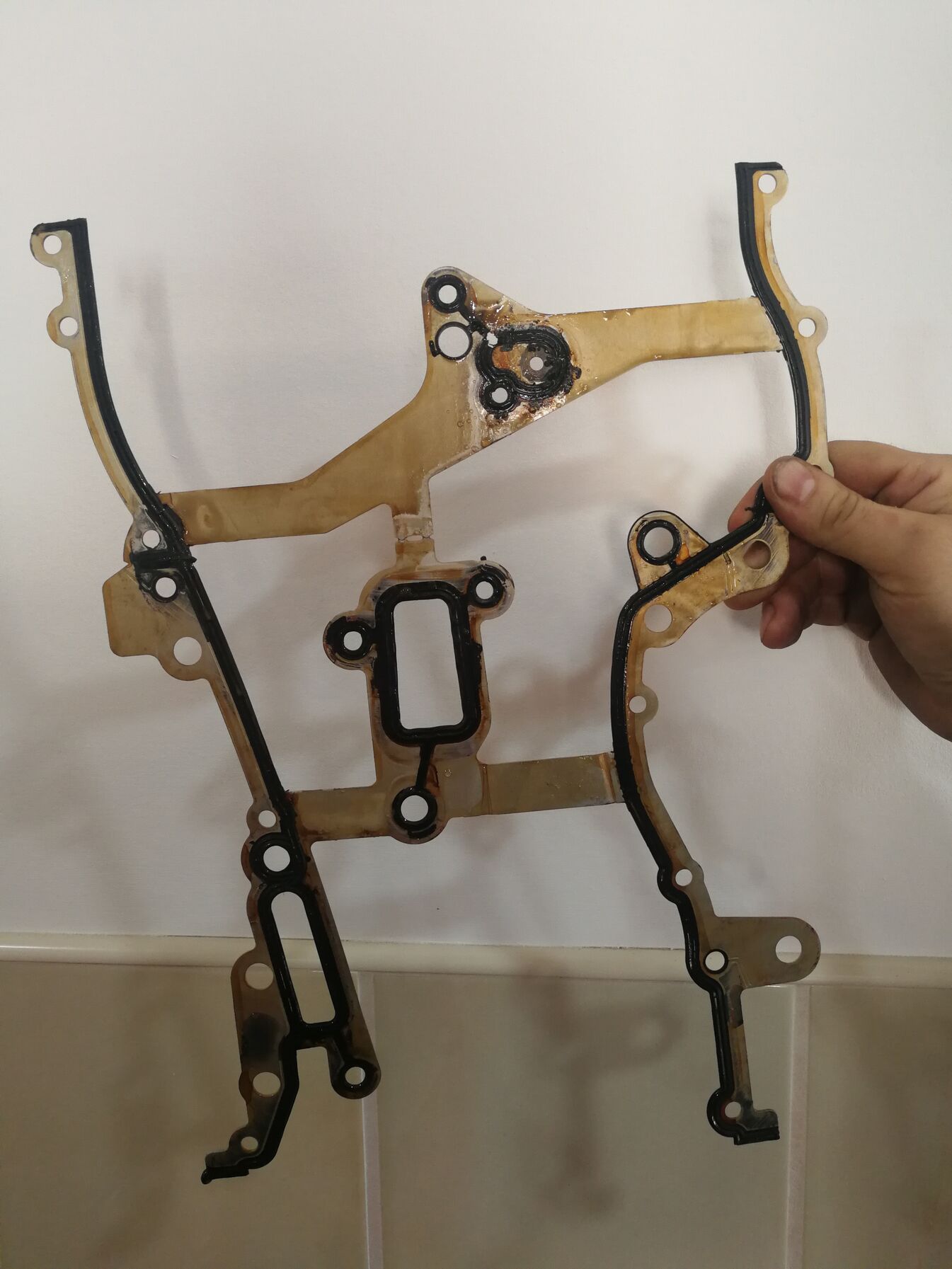 GGázolajjal, ecsettel könnyen tisztítható. Végülis sikerült leszedni a vezérműlánc fedelet. Kiékeltük a tengelyeket, levettük a láncot, beállítottuk a fogaskerekeket, és végre kezünkben volt a tömítés. Összehasonlítottuk az újjal, és hamar meg is lett a hiba. Valszeg gyári hibás lehetett.