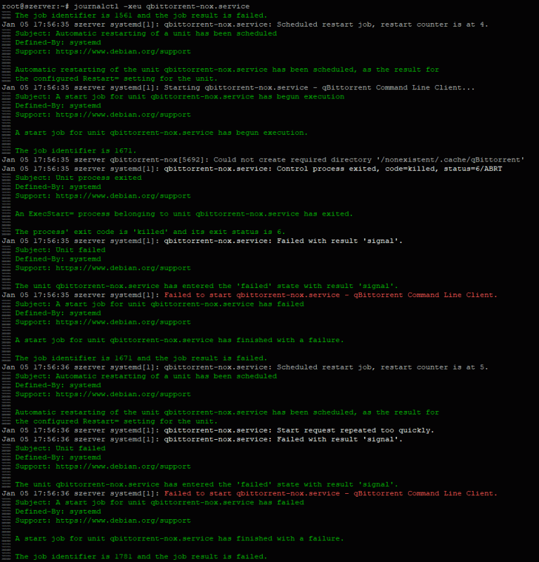 journalctl -xeu qbittorrent-nox.serviceRootként futtatni nem biztos, hogy a legjobb megoldás. Megnézem a leírást mert még nem találkoztam vele. Nálam a qbit dockerben fut.