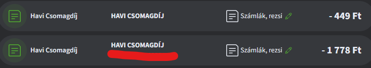 Tudja valaki, mi a különbség a két tétel között? A leírás szerint mindkettő a Bázis számlámhoz tartozik, de eddig csak a 449 Ft-os tétel volt levonva. Most megjelent pluszban egy 1778 Ft-os tétel is.