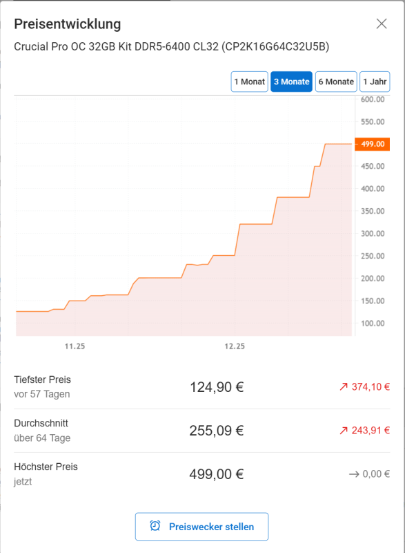 Figyelj, van egy 6400/CL32 2x16GB vadiúj bontatlan kitem. Neten 500€ az ára, és az árgrafikon felfelé megy, nem lefelé.