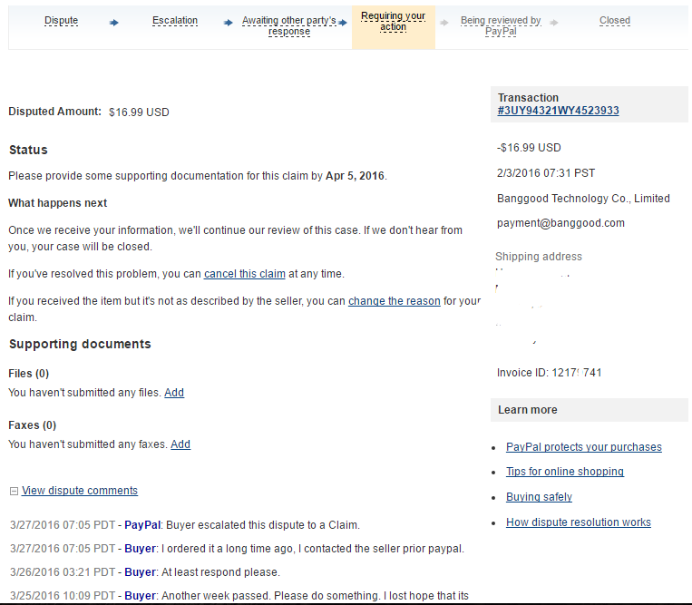 Egy Gearbest-es vásárlás után claim-et kellett indítanom (ez volt az első alkalom számomra), mert nem kaptam meg a terméket és a PayPal refund-ot ítélt meg, ami már látszik is ha belépek a PayPal fiókomba.