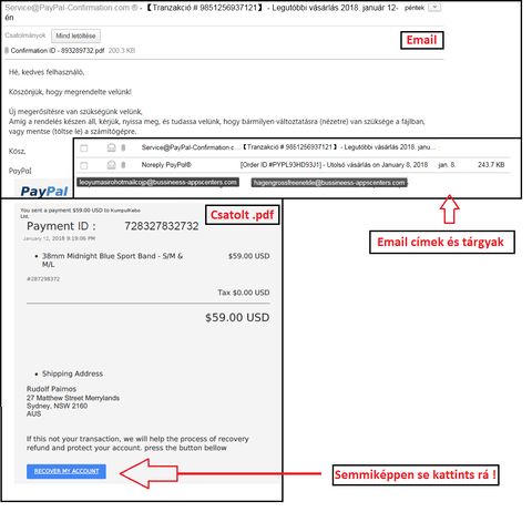 Szóval azzal akarnak próbálkozni hogy rendeltem valamit és 59$-t levontak a kártyámról és arra a címre küldik a csomagot ami lent van (gondolom valami random generált cím). Ha nem én kezdeményeztem a tranzakciót a akkor nyomjak "recover my account" gombra hogy visszakapjam a pénzem. Gondolom egy kamu PayPal oldalra dobna ahol bejelentkezel és akkor vitték is az adataidat. Az email magyarul volt de a .pdf már angolul, nem vették a fáradtságot hogy azt is lefordítsák
