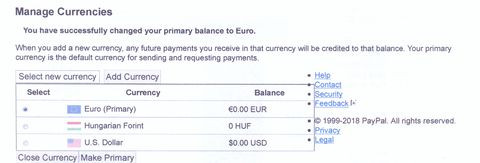 Évek óta vásárolok az ebayről (külföldről ) paypal-os fizetéssel az EUR alapú kártyámról. A régi kártya lejárt, és az új kártya rögzítésekor elfelejtettem a "primary currecy"-t EUR-ra állítani. Az első fizetés után vettem észre, hogy a számla Ft-ban került kiszámításra, és ebből konvertált vissza EUR-ra. Próbáltam átállítani a valutanemet EUR-ra a „Manage Currencies” menüpontban (lásd mellékletet). Bejelöltem az EUR-t és a „Make Primary”-t. A rendszer által küldött üzenet a melléklet első három sorában olvasható. A tegnapi vásárlásomkor megint Forintban számolt és EUR-ban csak a konvertált összeget emelte le.