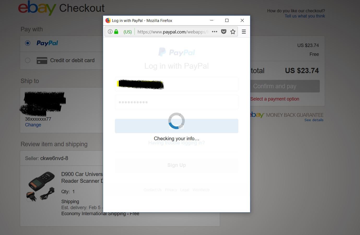 Lényeg, ami lényeg, az ebay összefoglalóban található lehetőségeket végigzongoráztam, de nincs változás, a paypal jelszó beírása után csak homokozik, checking your info felkiáltással. Ha elírom a jelszavamat, akkor persze egyből tudja, hogy rosszat írtam be. Sőt, már most az ebay-paypal linkelést sem tudom megtenni, hasonlóan az ebay topikban olvashatóakhoz.
