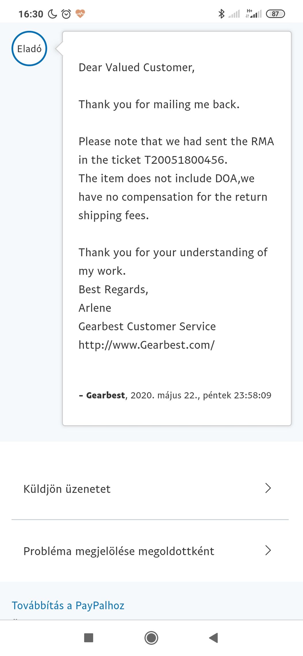 A Gearbest paypal vitában elfogadta, hogy küldjem vissza a terméket refundért.