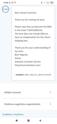 Az RMA-t elküldték a gearbestes ticketben, azzal nincs is gondom. Csak ugye így nem küldhetem vissza, mert le fog záródni a paypalos vita, és vége a védelemnek.