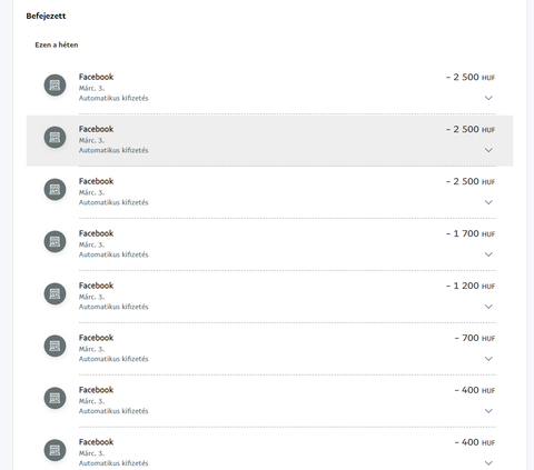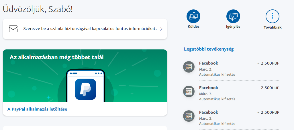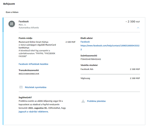 Több éve használom már a PayPal fizetést, de ilyet még nem tapasztaltam és egyszerűen nem jövök rá, hogy ez mi lehet. Kérdezem Én mi dolgom van nekem a facebookkal? Nem üzemeltetek rajta semmit. Miért kellene nekem bármit is fizetnem? Dobálja itt a mínusz összegekről az e-maileket, de szerencsére a kártyáról nem vonja le. Egyszerűen nem tudom mi lehet ez. És a legidegesítőbb az, hogy ha egy ilyen tranzakciót megnyitok nincs benne semmi, hogy vásároltam volna vagy bármi. A legutolsó képen látszik, ha megnyitom az egyik tranzakciót. Az összegeket összeadva lassan 10.000 forintnál leszek. Csak az a baj, hogy nem tudom mit vásároltam. Valaki találkozott már hasonlóval?