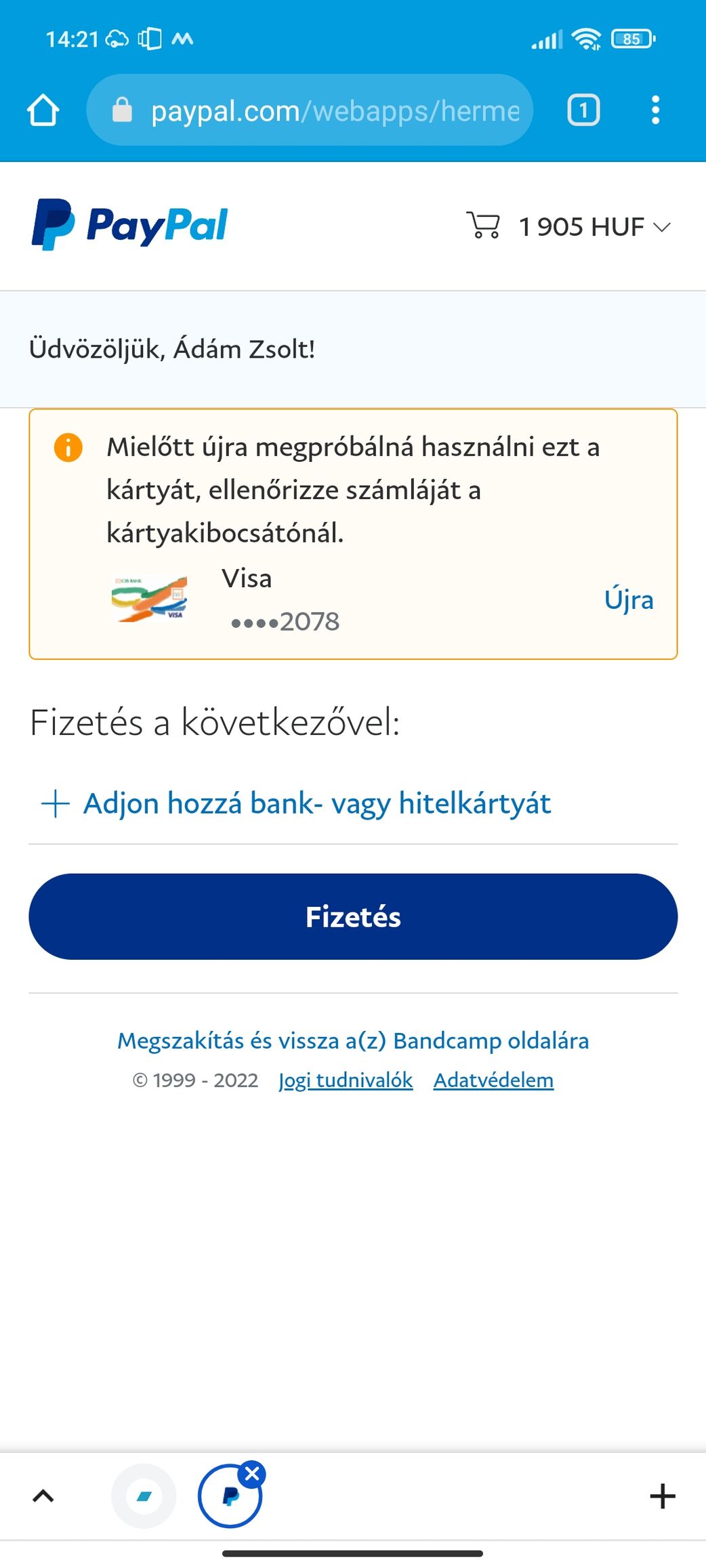 Sziasztok. Eddig nem volt PayPal fiókom, így semmi tapasztalatom nincs vele. Tegnap akartam venni egy albumot a Bandcamp oldalon és a szerző csak PayPal fizetésen keresztül engedi a tranzakciót. Nosza csináltam is egyet. Beregisztráltam a CIB bankos VISA Inspire kártyámat, amit el is fogadott. Meg lett terhelve, hogy validálja a PayPal, ami sikeres is lett, de fizetni azt nem tudok vele. Pénz az van a kártyán elég, így nem értem a problémáját. Más felületen a kártyával már fizettem, működik az NFC-s fizetés Google Pay-jel is. Tegnap utaltam rá pénzt, de az sem érkezett még meg. Mellékelem a képet, amit kiír a sikertelen fizetéskor: