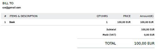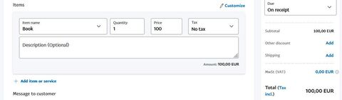 2. Jobb oldalt az Other amount-nál hozzáadsz egy MwSt (VAT) 0,00 € értéketA számlán így jelenik meg