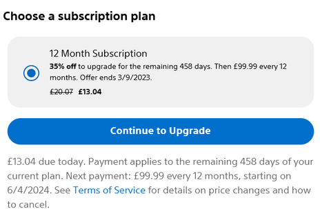 ) tudok mutatni azoknak akik a Ps Plus Extrárt vagy Prémiumot szeretnék az akciós 1 havi időtartamra megvenni, de ma még esetleg nem tennék meg - egyébként ma éjfélig szól az akció.Nos vegyétek meg a Ps Plus Essentialt vagy az Extrát (300 illetve 900 forint) és így a magasabb szintre váltást március 9.-ig lehet megejteni így.