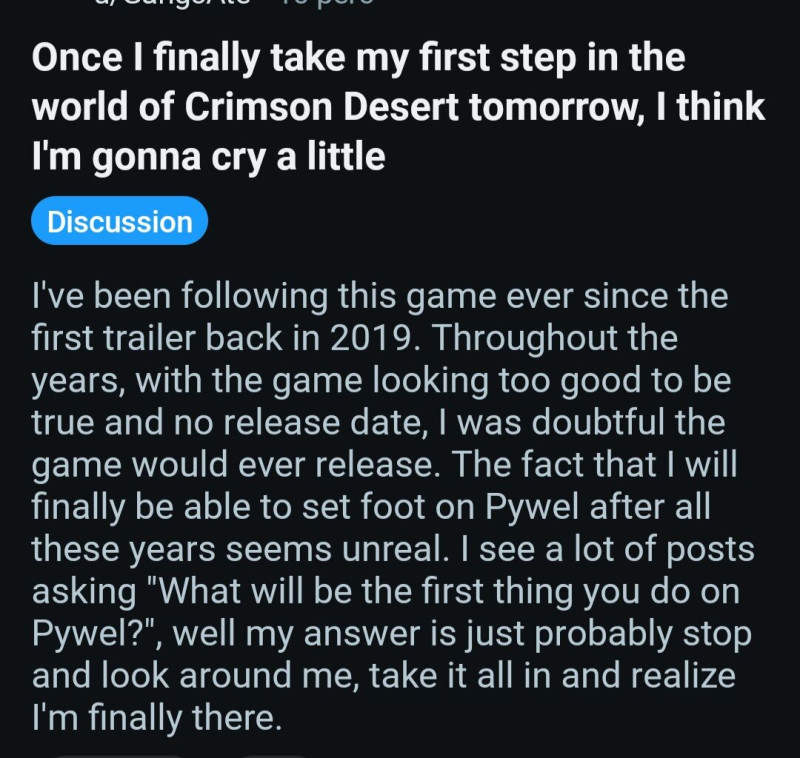 TLDW: Crimson Desert is a generational game. A game that fundamentally changes our perception of what is possible in the medium. Its open-world, exploration, and sheer scale all offer something that almost no other game has even attempted. It's NOT perfect: there are bugs, occasional quality dips, and its scope can sometimes leave ideas on the table for too long, but overall I'm thoroughly impressed. After 60+ hours I'm loving it. I think it will probably take me 120+ to roll credits and likely 300+ for a completionist run; even so, I cannot wait to see what else the game has tucked away for me to find and I'm actively playing it even while writing this pinned comment.