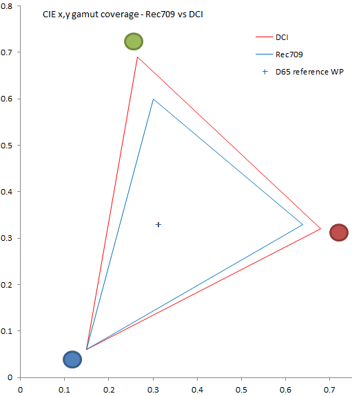 A marketinganyagban egyedül a vörös foszfort emlegetik, hogy ez hiányzott a DCI gamuthoz, holott a vörös foszfor fénye eddig is erősen szaturált volt, DCI-nál pedig a zöld irányában is erősen tág színtér, csak a kékben egyezik a Rec709-el. A régi kék szín pedig épp csak hogy megüti a Rec709 gamut határát (mikor úgy esik, akkor a szoftveres újrakeverés miatt nem is sikerül tökéletesen megütni), és a zöld is túlszaturált már évek óta, de nem olyan nagy mértékben, hogy könnyebben üsse meg a DCI-t, mint az eddigi vörös.