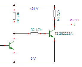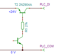 Az alsó a venti beépített OC tranzisztora, a terhelés pedig (amire a T2 dolgozik) a PLC belső 5,2 kΩ-os ellenállása, amit nem rajzoltam ki. A többi feltétel ugyanaz, a T2 lehet pl. 2N3906, BC212, BC327, BC556, BC557, BC558, stb. -