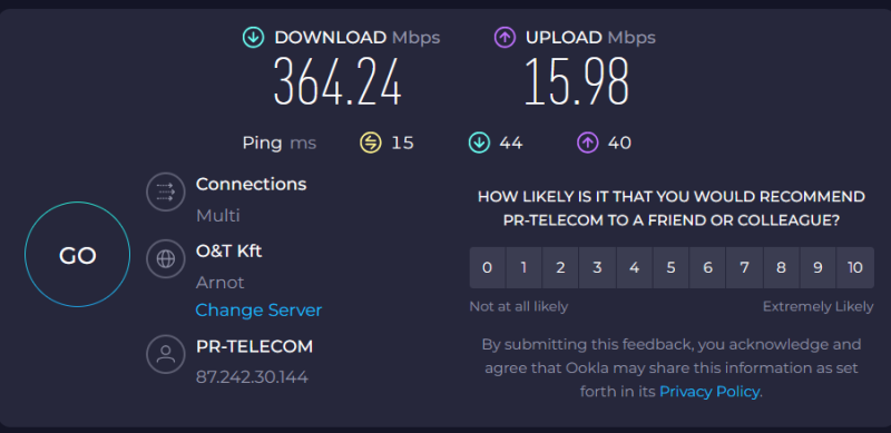 Szia! Laptoppal is mértem sebességet még 05.23-án 185/201, 252/120. Egyébként áramtalanítva is volt az ONT úgy ahogy írtad. Pénteken mikor telefonon beszéltem a PR ügyfélszolgálatossal,hogy mit csináljak mondta hogy mérjek kábellel sebességet(erre mondtam én,hogy csak tv-vél tudok,mert a laptopunk csak wi-fi-vel tud csatlakozni),akkor a tv-én mérjék azt mondta a PR-ős ill annyit mondott még,hogy áramtalanítsam. Laptoppal csak azért tudtam mérni sebességet kábellen, mert sógorom még pont itthon volt pénteken és csak este ment vissza Pestre és oda adta a gépét a mérés idejére.Most már csak tv tudok mérni kábellel sebességet.Sajnos párom gépe csak wi-fi-vel tud netre csatlakozni ahogy fentebb írtam.A digis ismerősöm annyit mondott még, a tv és a laptop mért sebességeire,hogy ekkora eltérés nem lehet a kettő eszköz között.