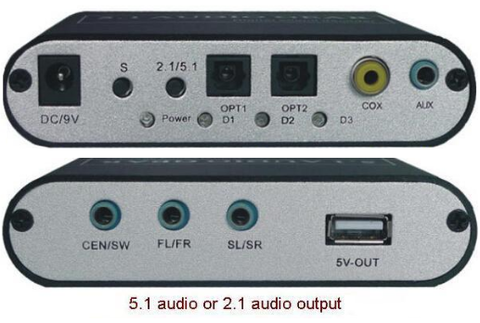 Én az optikai kimenetet alakítanám 5.1 analóg jellé, és azt kötném be.Digital Optical Audio decoder to 5.1
