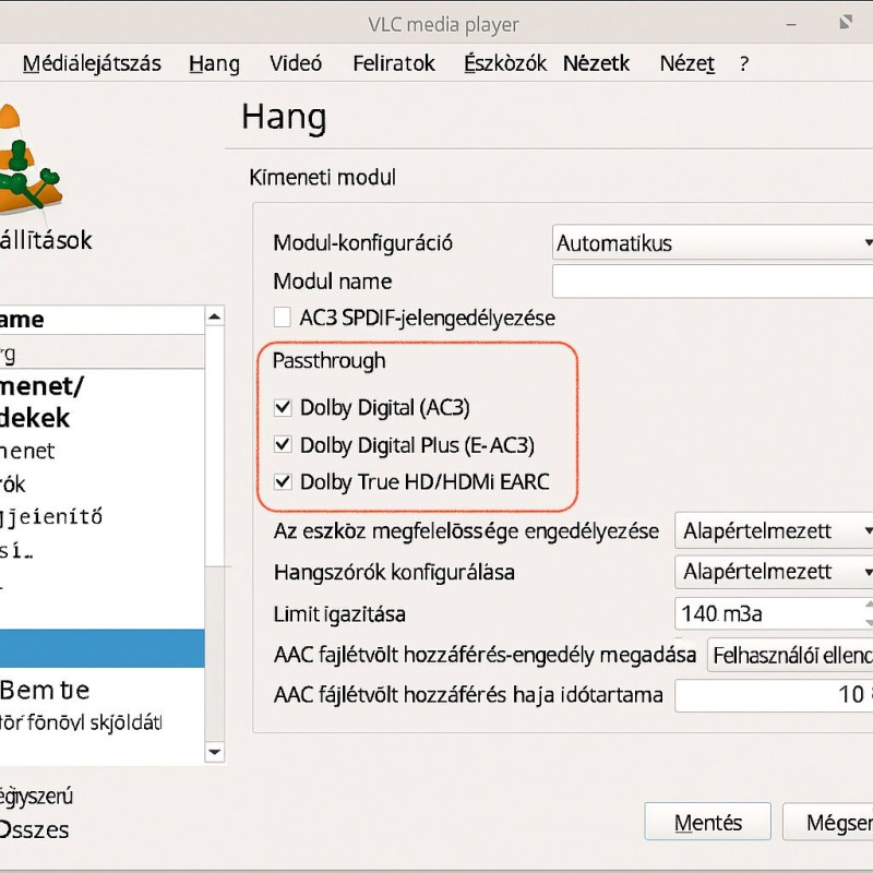 Ha nincs ilyen opció, állítsd a hangkimenetet ALSA-ra, és az eszközt HDMI direkt hardvere Device without any conversion-ra. (Nincs VLC-m, de valami hasonló lesz ott is.)