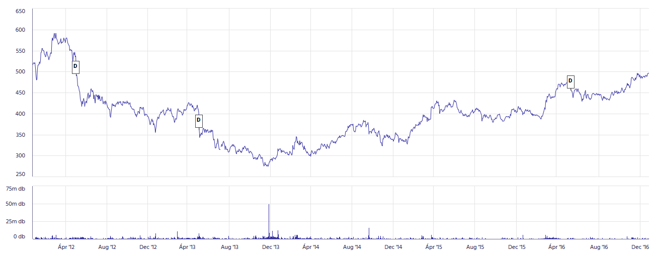 Tessék a részvényárak alakulása az elmúlt 5 évben. BÉT árfolyamHa olyan jó biznisz lenne, akkor meredekebben emelkedne. Oké 3 éve fordult a kocka, de azt is számításba kéne venni, hogy volt 2000Ft is a részvény, és hosszú évekig 1000Ft környékén ingadozott, most meg 500Ft.