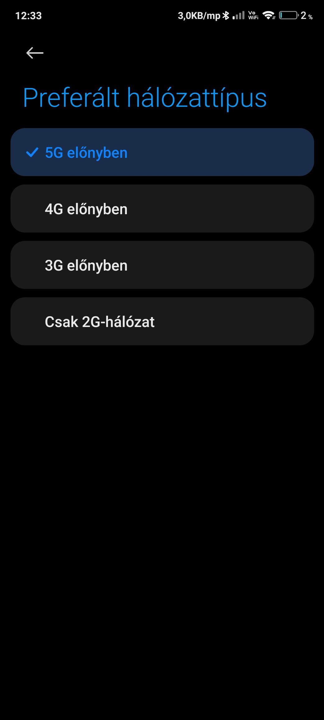 #3359Kolondrum: Csak ott van 5G a preferred alatt, amelyik a default mobiladat SIM. Nálam ez a Vodás. Szóval a trénoros káryánál csak az LTE-ig tudom húzni.