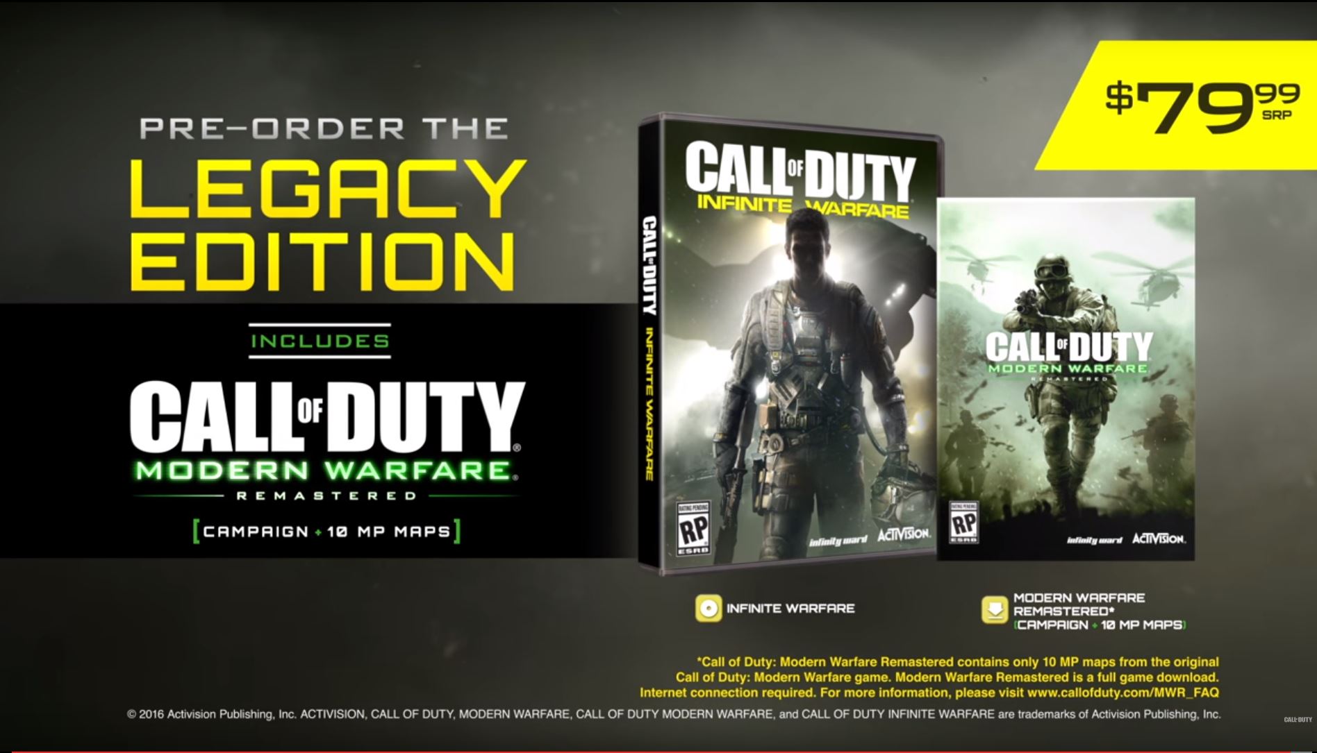• Legacy Edition and Digital Legacy Edition – Includes both Call of Duty: Infinite Warfare and Call of Duty: Modern Warfare Remastered, SRP 89,99 €.