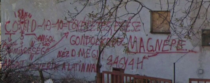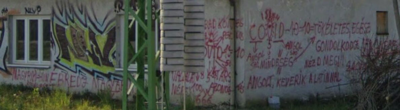Nálunk itt egy elhagyott ház falán volt firkálva valami antivaxer-szerű baromság feladvány. Totál agymenés volt. (Covid, nagy V-vel, abból egy pina kialakítva, meg volt valami szem, meg egyetlen, á, érthetetlen volt)