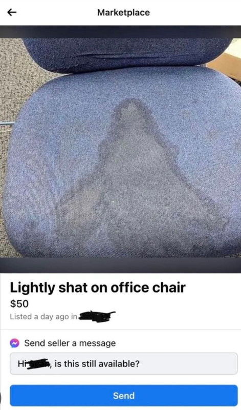 Az irodai szék az inkább troll, mert nagyon telibe fotózta az undorító seggizzadás foltot, ráadásul túlzottan tiszta a többi részen, olyan mintha direkt bevizezett koszos nadrággal beleült volna párszor lenyomatot csinálni rá, sokkal mocskosabbnak kéne lennie összesítve is egy valóban elhanyagolt széknek.