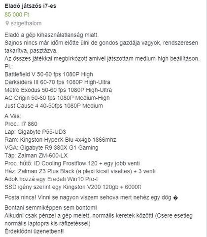 Engem is átvert egy illető még jó pár évvel ezelőtt. Szülinapomra szerettem volna meglepni magam 500GB HDD-t. Mit kaptam? Egy kattogós HDD-t ami mostanáig is ittvan nálam meg 10k ft. Mondtam neki hogy költse gyógyszereire a pénzt meg a kiscsaládjára. Azóta óvatosabban és megfontoltan vásárolok. Tanulni kell a hibából,mert magamnak köszönhetem hogy egy újoncnak hittem.