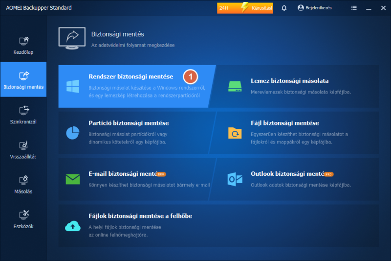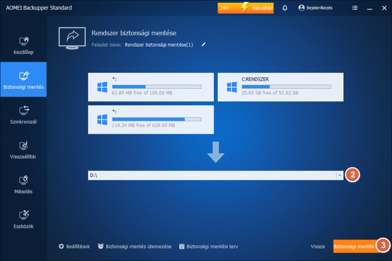Aomei esetén a "Rendszer biztonsági mentése" lett kijelölve, nem pedig a "Lemez biztonsági másolata", vagy a "Partíció biztonsági mentése".