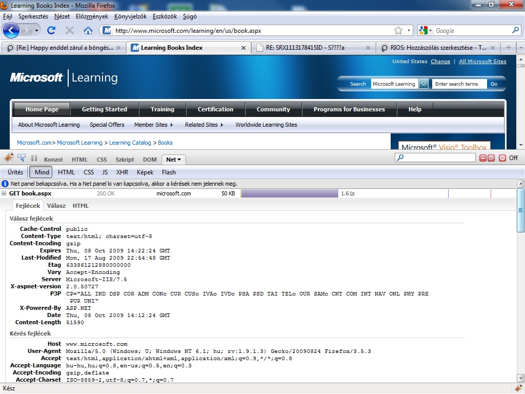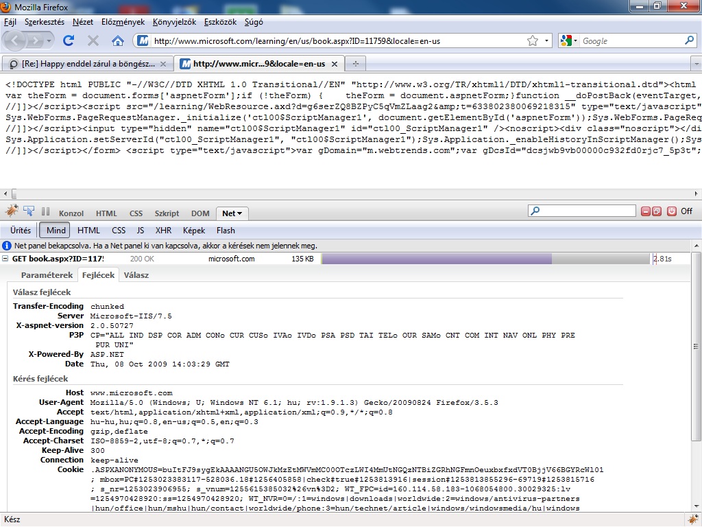 Megírtam az Ms Magyarországnak, hogy hibás az egyik oldaluk hibás, valamilyen bug miatt a http header durván hiányos, ha konkrét könyveket néznék az oldalukon. FF alatt ez azt eredményezi, hogy csak forráskódot mutat [link], mivel hiányzik a content-type.