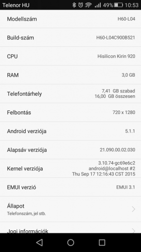 Honor 6, L04 típusú a telóm, legújabb frissítéssel. B 521, EMUI 3.1az egyetlen probléma a telefonnal az üzemidő,pár hónapja kezdődött el,már olyan szinten nem bírta,hogy minimális használat mellett 16-18 órát bírt ki, wifivel meg extrákkal a 10 óra volt a maximum kb.