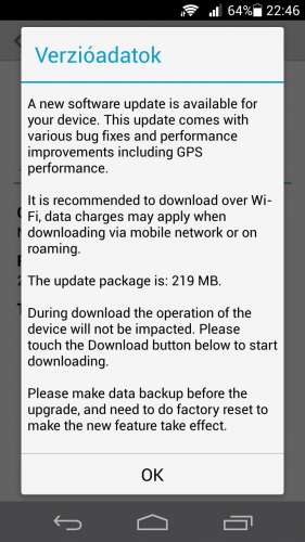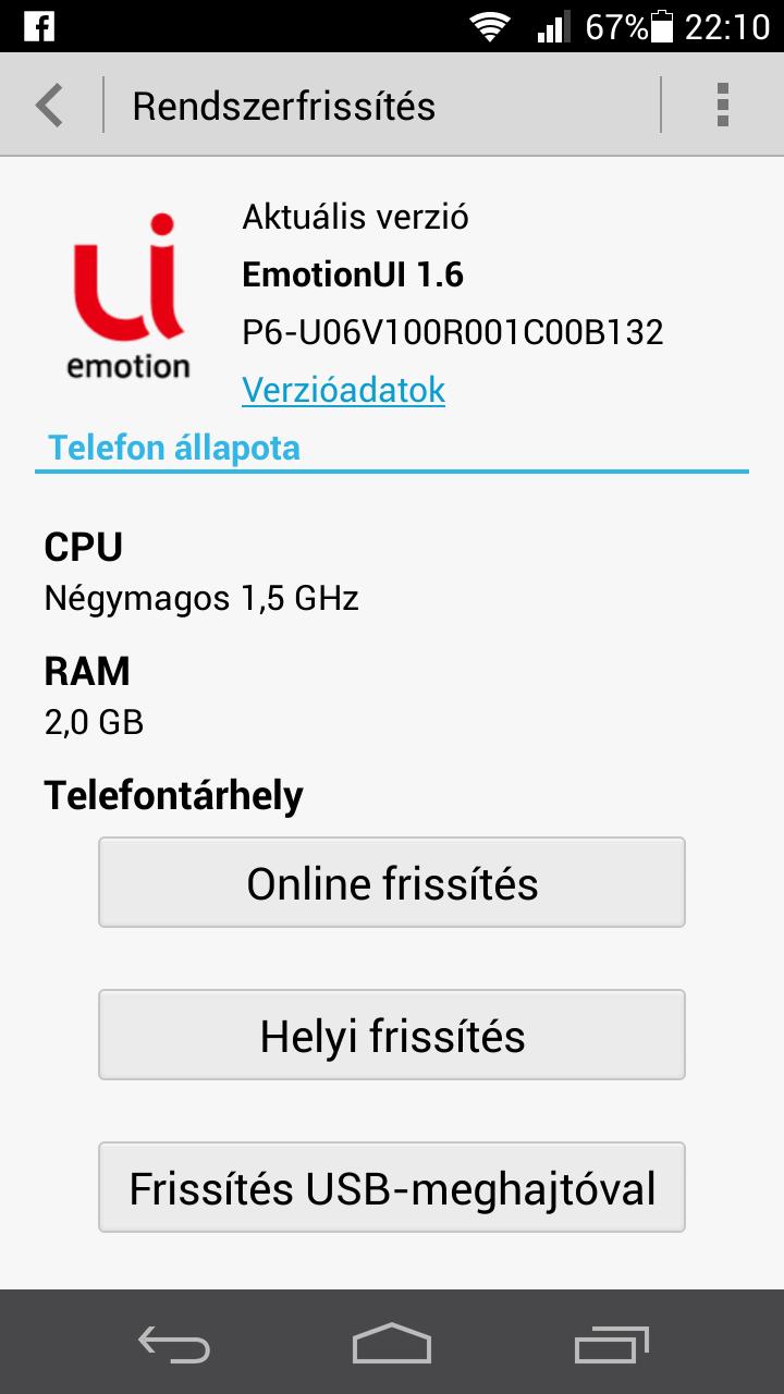 sziasztok, most nézten én is a frissítések menüt, (most b132 van rajta) ha rámegyek arra hogy online frissítés azt írja hogy nincs semmi frissíteni való, de ha arra kattintok hogy "verzióadatok" akkor pedig kiírja hogy elérhető egy 219 megás frissítés, most akkor van fríssítés vagy nincs, vagy csak ota-n keresztül nem elérhető?