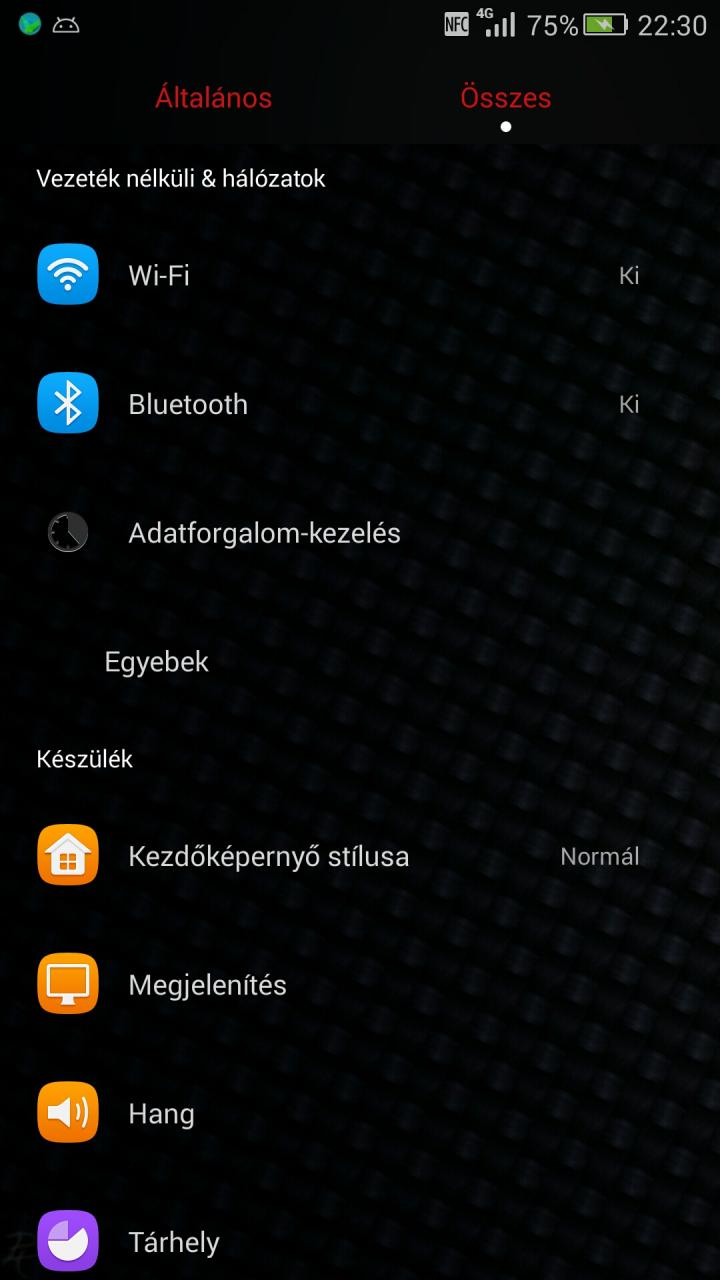 Marad az EMUI 2.3. Mobilhálózatoknál nincs 2G-3G, csak GSM, WCDMA, LTE, EvDo, TD-SCDMA... és ezek variációi. A témaválasztó nem működik. Mozgásvezérlés menü üres. És ha nincs bekapcsolva a roaming, nincs mobilnet sem.