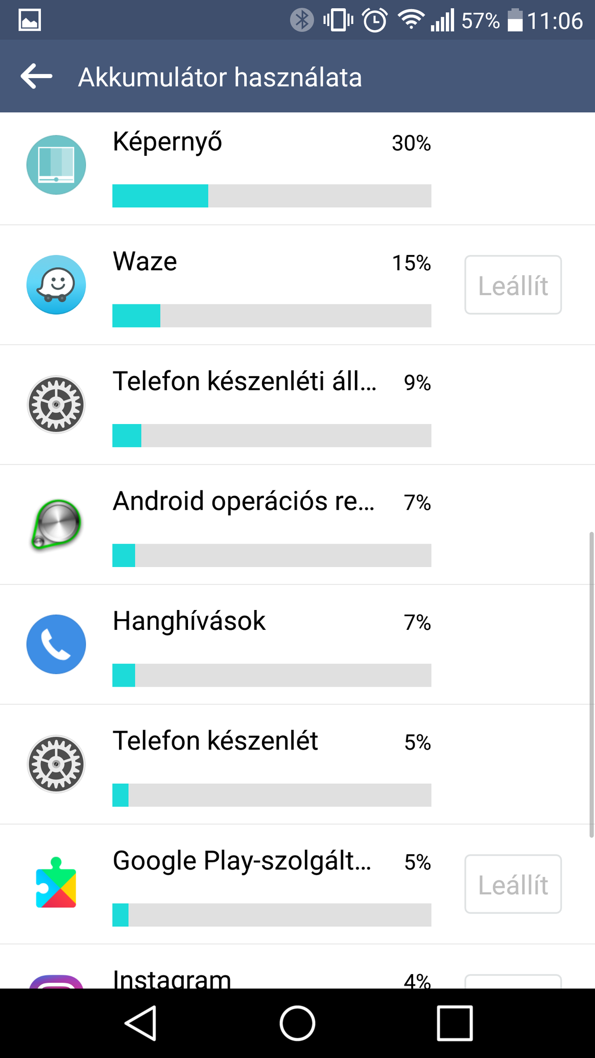 Google Now, Helyelozmenyek es LG adatgyujto kikapcsolasara gondoltam de ha ezek be vannak kapcsolva se merulhet ennyit.A helyelozmenyek rendesen porgeti a Google Play Services -t ami szinte folyamatosan hasznalja a helyadatokat, CPU -t stb.