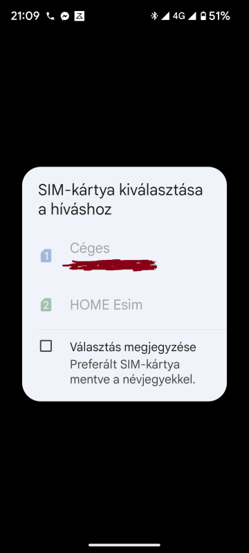 A hívás elindul, kikerül a telefonra, de ott feljön a "Sim kártya választó" ablak. Az a furcsa, hogy az ablak inaktív és a "pipa" hiányzik, pedig a kapcsolat beállításoknál minden be van állítva. Eddig ezzel nem volt gondom, a preferált kártyán indította a hívást.