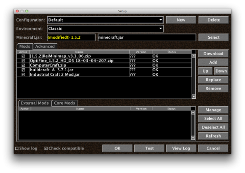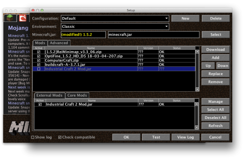 1.5.2 van nekem felrakva Mac-re, ehhez a verzióhoz tartozó forge-ot is felraktam és a MagicLauncher is fenn van. Computercraft, Buildcraft, Optifine és Rei's minimap is fenn van, tökéletesen működnek. Szeretném az industrialcraft-ot is beüzemelni. Leszedtem az 1.5.2-höz tartozó IndustrialCraft-ot, MagicLauncher-be hozzáadtam a .jar-t, de nem indul el a játék, megáll a "Mojang" feliratnál.