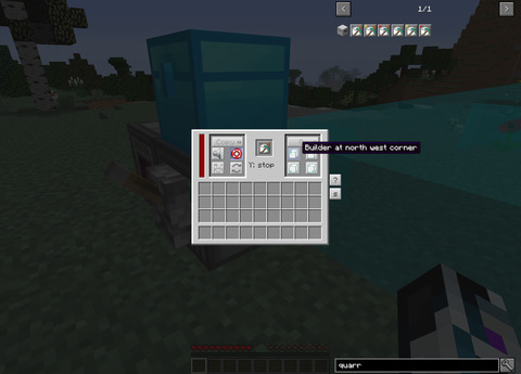 Builder klikk, megnyílik a gui, a card megy középre megy, jobb oldalon a kockákon vagy bal vagy jobb felső sarok kijelöl, majd a kártyától balra a kerek ikon klikk -support/preview mode-. Utóbbi ghost blokkokkal mutatja mit fog ásni a gép és hol.