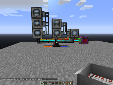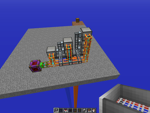 A BC csövek káprázatosan szarok, az emerald csövek után raktam vas csövet és utána aranycsővel vezettem át a controllerbe. Végül is működik, igazam volt abban hogy a cuccokat oda-vissza fogja lökdösni a három sor kimeneténél, de mivel nem termelnek túl gyorsan, szépen elpattognak pár kört végül a random sorolás miatt megtalálják a negyedik leágazást és továbbmennek. Nem jópofa, de működik.