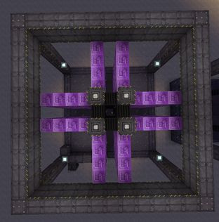 Kristály viszont lazán visszatermeli, egy tartályból kettő jön ki, ezek kapnak 3 stack gunpowdert meg 2 stack netherquartzot, előtte 3x szűrni, utána 2x és így lesz 100/85/70/80. Éhezés2 sugárzást ad, de ott van a quarry mellett úgy is messze, a földet nem szennyezi be ilyen minőségben szóval nem is kerítem körbe, csak lerakom a 4 blokkot ami kell és megy, pedestal pedig auto rakja ki neki és szedi be az elhasználtat.