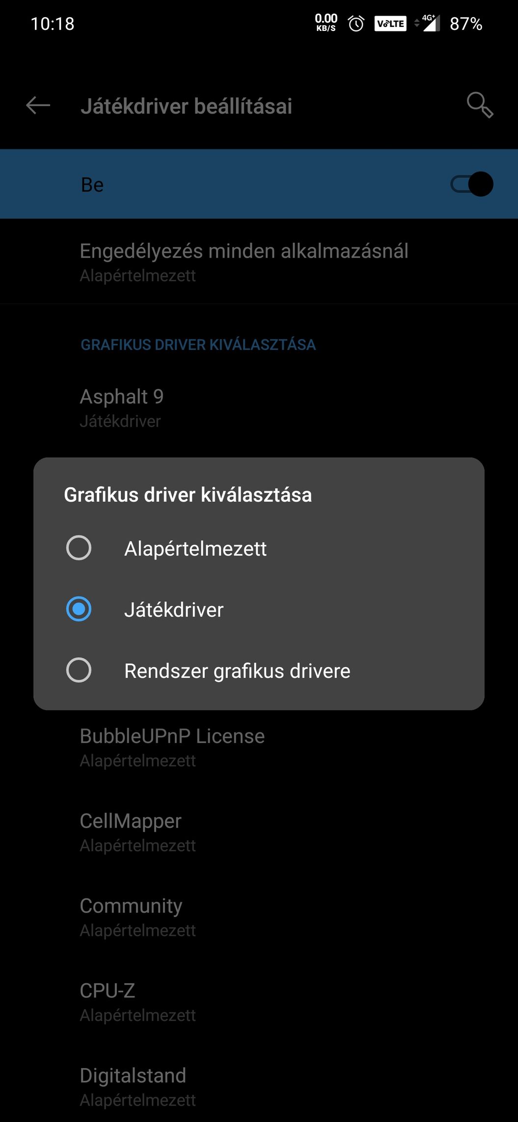 Fejlesztői menüben kiválaszthatjuk, hogy melyik app melyik grafikus drivert használja. Van alapértelmezett és játék driver is. Majd tesztelem az Asphalt 9-et játék driverrel.