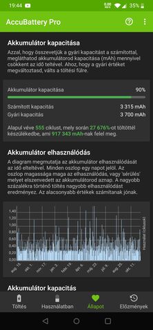 B-verzió, az AccuBattery használata. Én a képernyőidőket (SOT) és a számított degradálódást is ezzel nézem igazából. OnePlus Diagnostic csak megerősítés. Gyakorlatilag 1% eltérés van a kettő között. Ennél viszont végig kell vinni néhány töltés-merülést. Úgy 40% töltés után lesz értékelhető egy-egy feltöltési ciklus pontossága. Két nap - egy hét között már el kell találja nagyjából pontosan az akksi állapotát. Minél nagyobb százalékot tolsz a telóba és minél többször, annál jobb lesz. (Képen még egy novemberi állapot pl. az én 7-esemnél).