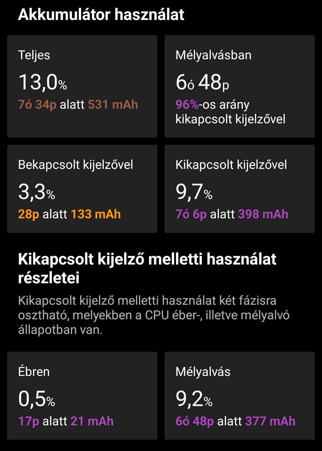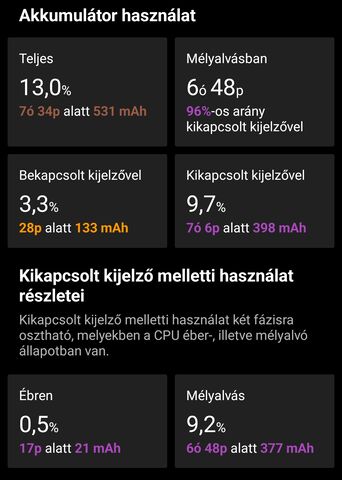 Sikerült szert tennem egy OnePlus 7t Pro-ra. Android 12 szépen le is frissítettem majd egy factory reset. Az első problémám az akkumulátor üzemidő. Korábban egy Note 10 Pro készülékem volt és az kevésbé merült Android 13 és MIUI 14 mellett. Viszont a hardverét tekintve jobb és jobban optimalizáltnak tartom a 7t Pro-t. Van olyan szoftver amivel az akkumulátor élettartamát meg tudom nézni, mert lehet csak cseréltetnem kellene. Vagy ez a készülék ezzel a gyári aksival ennyit tud bár a két készülék között van közel 1000 mAh. Lehetséges, hogy 2,5 év alatt ennyit amortizálódik a használattól? Sosem volt OnePlus telefonom egyelőre csak teszt céljából van nálam és tetszene is, ha fény derülne az aksi problémára, ha egyáltalán az.