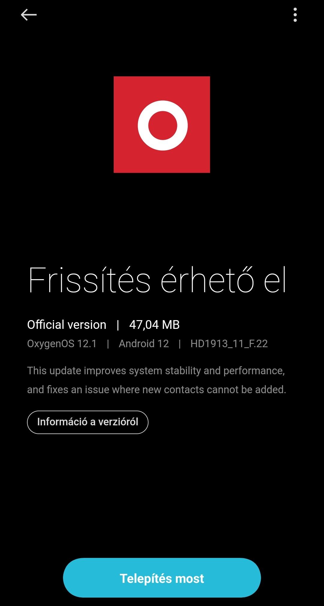 Az utolsó hivatalos kiadás "Official versionOxygenOS 12.1 | Android12 | HD1913_11_F.22".